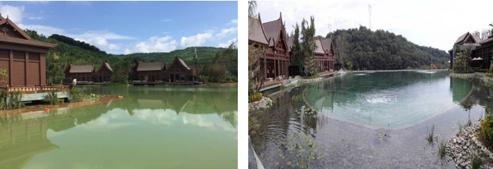 就以萬達西雙版納國際度假區來說,承擔了其酒店群的主樓前場、SPA區的兩個人工景觀湖水處理的改造項目,水面面積約8000m2、水量30000m3,處理后的水質達到地表水Ⅲ類標準,整個方案采用了“生態治理法+機械曝氣”的水處理工藝。