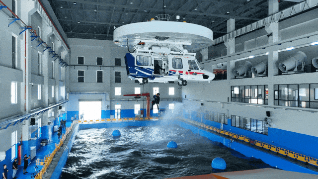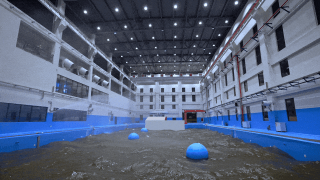 環(huán)境仿真方面,臺(tái)風(fēng)訓(xùn)練館配備了造浪球、風(fēng)機(jī)、特制燈光、音響等設(shè)備,能夠讓場(chǎng)館內(nèi)達(dá)到環(huán)境最大風(fēng)力≥12級(jí),最大降雨量≥50mm/h,最大環(huán)境噪音≥120db,最大造浪高度≥1.2m,基本復(fù)現(xiàn)最大12級(jí)臺(tái)風(fēng)災(zāi)害下,風(fēng)、雨、浪等復(fù)雜的救援環(huán)境。
