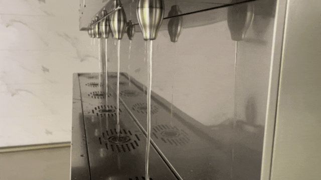 此次校園共配備戴思樂®校園凈飲水設備8臺,搭載反滲透負壓勻柔流專利技術,確保出水純凈,水流穩定;采用“兩開四溫”可調模式(開水配“童鎖”功能),每臺設備設有6個出水嘴,且均配置紫外消毒功能;同時,接水臺還加裝防濺面板,構建安全、健康的接飲水環境。