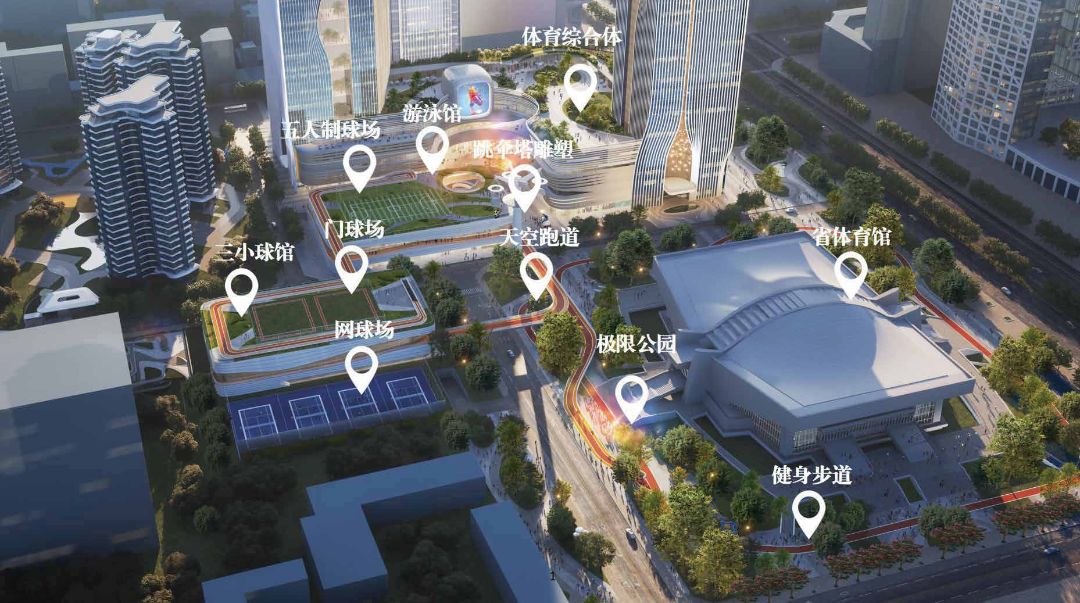 作為四川省重點建設項目,國際體育公園城選址武侯區人民南路與一環路交匯處,總投資45億元,總建筑面積約28萬平方米,包括新建辦公樓、泛體育產業孵化園、科技創新平臺、體育博物館、文化活動中心等基礎配套設施。